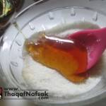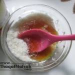 – ضعي الأرز في وعاء وأضيفي العسل تدريجيا مع التقليب بملعقة حتى تحصلي على عجينة سميكة ذات حبيبات .