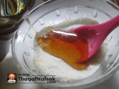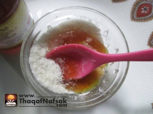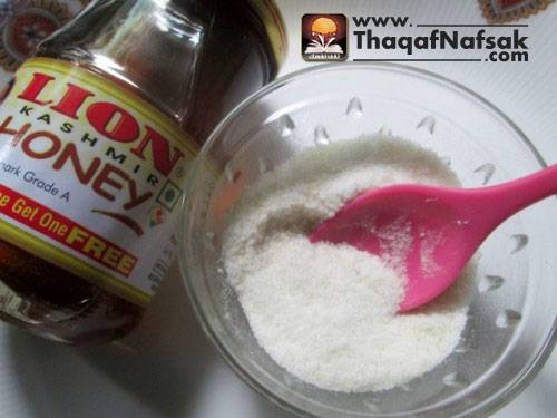 – ضعي الأرز في وعاء وأضيفي العسل تدريجيا مع التقليب بملعقة حتى تحصلي على عجينة سميكة ذات حبيبات .